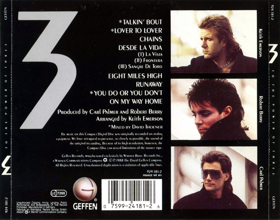 사실 에머슨은 억울했을 것이다. 왜 별로 차이도 없는데 아시아Asia나 GTR은 뜨고 ELPowell은 못떴을까 하고 말이다. 사실 그럴만도 한게 ELPowell은 ELP가 80년대에 걸을만한 사운드의 변화를 가지고 온 앨범이었으며 그 결과물도 나쁘지 않았으니 말이다. 코지 파웰이 빠져나간 덕에 ELPowell은 유지될 수 없었지만 에머슨은 다시한번 재결합을 시도한다. 이번에는 그렉 레이크가 참여를 거부하는 바람에 안되나 싶었는데 당시 아시아에서 나왔던 칼 파머와 합쳐서 결국 과반수는 넘겼다. 나머지 한명은 신예인 로버트 베리로 채웠는데 애석하게도 베리는 L로 시작하지 않았기 때문에 ELP라는 이니셜은 살릴 수 없었다. 그래도 3인조라는 특색만은 강조하고 싶었는지 그룹명을 3로, 앨범타이틀을 To the Power of Three라고 지었는데 솔직히 유치해도 이럴수가 있나 싶다.