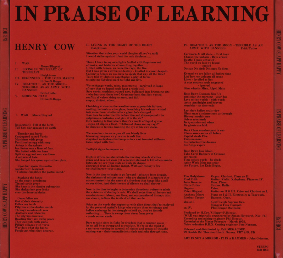 74년 구월 시월에 헨리 카우는 네덜란드에서 프레드, 팀, 죤, 크리스 이렇게 4인조로 공연을 가졌다. 거기서 이후 Living in the Heart of the Beast가 될 3분짜리 초기 작곡을 연주했었다. 십일월에 우리는 슬랩 해피와 Desperate Straights를 녹음했고 우린 밴드를 합치기로 했다. 우린 피터 블렉바드를 파우스트의 멤버로 만났었는데, 레인보우에서 가진 공연시 그는 우리와 함께 연주했다. 크리스 커틀러는 슬랩 해피가 버진에서 녹음한 그 미숙아같은 데뷔 싱글에서 연주해준 바가 있고. 프레드 프리스, 죤 그리브즈, 린제이 쿠퍼는 모두 슬랩 해피의 필 세션과 결국 공개되지 못했던 Europa싱글에서 연주했었다. In Praise of Learning은 합쳐진 그룹의 첫번째 앨범이 될 것이었다. 하지만 앨범 낸지 얼마 안되었던 75년 2월에 그룹은 다시 깨졌다. 다음해부터 헨리 카우의 라인업은 다음과 같고 In Praise of Learing에 관한 공연은 그 멤버로 이루어졌다. 팀 호지킨슨, 프레드 프리스, 죤 그리브즈, 크리스 커틀러, 린제이 쿠퍼 그리고 다그마 크라우제.