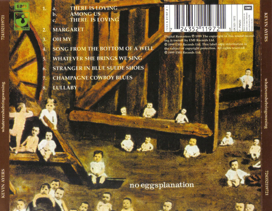 | TRACKS: | 1. There is Loving/Amongst Us/There is Loving (3:04) 2. Margaret (3:20) 3. Oh My (2:59) 4. Song From The Bottom Of A Well (4:37) 5. Whatevershebringswesing (8:13) 6. Stranger In Blue Suede Shoes (3:24) 7. Champagne Cowboy Blues (3:56) 8. Lullabye (2:14) Total Time: 36:09 Bonus tracks on Eclipse remaster (2003): 9. Stars (3:32) 10. Don't Sing No More Sad Songs (3:46) 11. Fake Mexican Tourist Blues (4:38) 12. Stranger in Blue Suede Shoes [Early Mix] (3:19) |