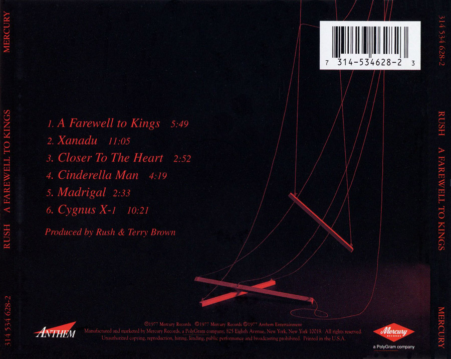 | TRACKS: | Side 1 1. A farewell to kings (5:49) 2. Xanadu (11:04) Side 2 3. Closer to the heart (2:51) 4. Cinderella man (4:19) 5. Madrigal (2:33) 6. Cygnus X-1 (10:21) |