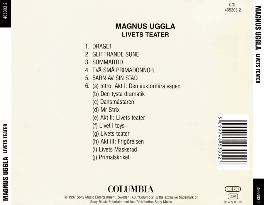 | TRACKS: | 1. Draget 2. Glittrande Sune 3. Sommartid 4. Två Små Primadonnor 5. Barn Av Sin Stad 6. (a) Intro; Akt I: Den Auktoritära Vägen (b) Den Tysta Dramatik (c) Dansmästaren (d) Mr Strix (e) Akt II: Livets Teater (f) Livet I Toys (g) Livets Teater (h) Akt III: Frigörelsen (i) Livets Maskerad (j) Primalskriket |