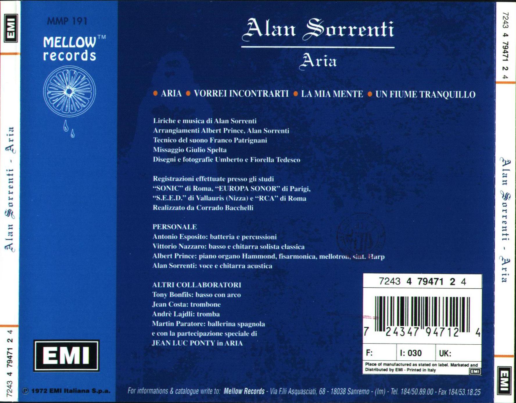| MUSICIANS: | - Alan Sorrenti / vocals and acoustic guitar - Antonio Esposito / drums and percussions - Vittorio Nazzaro / bass guitar and lead classic guitar - Albert Prince / organ hammond, accordion, mellotron, synth harp - Tony Bonfilis / bow bass - Jean Costa / trombone - André Lajdi / trumpet - Martin Paratore / spanish dancer Guest musician: - Jean Luc Ponty / violin (1) |