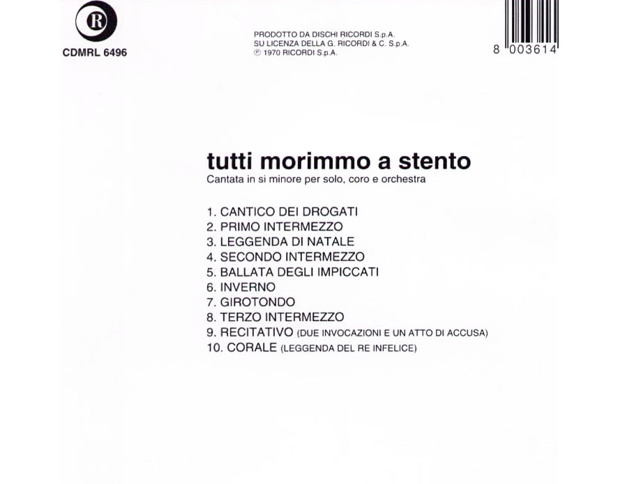 TRACKS: | 1. Cantico dei drogati 7:07 2. Primo intermezzo 1:57 3. Leggenda di Natale 3:14 4. Secondo intermezzo 1:56 5. Ballata degli impiccati 4:20 6. Inverno 4:11 7. Girotondo 3:07 8. Terzo intermezzo 2:10 9. Recitativo (Due invocazioni e un atto di accusa) 0:47 10. Corale (La leggenda del re infelice) |