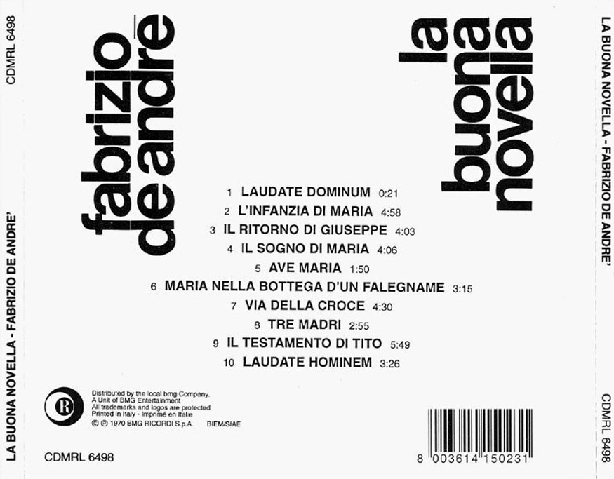 TRACKS: | 1. Laudate Dominum (0:21) 2. L'infanzia di Maria (5:02) 3. Il ritorno di Giuseppe (4:08) 4. Il sogno di Maria (4:10) 5. Ave Maria (1:23) 6. Maria nella bottega d'un falegname (3:14) 7. Via della Croce (4:33) 8. Tre Madri (2:55) 9. Il testamento di Tito (6:50) 10. Laudate Hominem (3:34) |