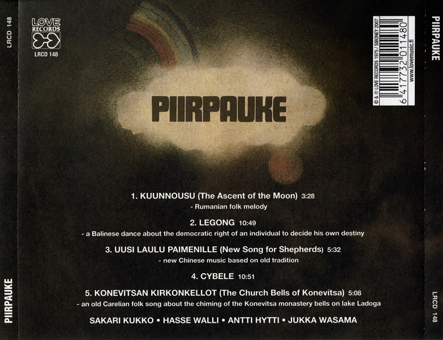 "사랑“이란 이름을 내건 레코드사 Love Records! 자칫 유치하게 들릴 수 있는 레코드사 이름이다. 그러나 턴테이블 위에서 돌고 있는 이 화사의 로고를 바라다 보고 있노라면 또다시 사랑에 빠질 것만 같은 설레임에 견딜 수 없다. 두 개의 빨간색 하트가 모여, 귀여운 큐피트 화살모양을 하고 있다. 지난 봄, 홍콩에서 만난 핀란드 아줌마에게 Love를 아냐고 물었더니 꽤 당황하는 모습이었다. 레코드사 이름을 의미했던 것인데... 이번에는 피르파우케를 아느냐고 물었더니, 오해가 풀렸던지 물론 안다고 고개를 끄떡거렸단. 그녀는 Art Rock 한권과 나의 명함을 받아들었고, 그것을 Love Rec에 전달해 주겠노라고 약속했다. 이렇게 해서 오랫동안 추적해왓던 Love Records사와의 숨박꼭질은 일단락 되었다. 지난 몇 년간 추적해왔던 Love Records사는 이미 핀란드 전화번호부에 지워져 버린 이름이었다. 그러나 아직까지도 음원의 소유주는 남아 있었다. 작년 독일에서 그 사실을 확인하게 되었지만, 국내에 어떠한 작품을 소개해야할지 막막햇었기 때문에 약 9개월동안 연락 하지 못하고 있었던 것이다. 유난히 실험적인 작품들이 많았던 레코드 레이블이었기에 계약에 앞서 망설이지 않을 수 없었다. 그러나 본작 Piirpauke의 음악에 깊이 빠져들면서 나는 용기를 얻기 시작했다. 그리고 편지를 여러차례 주고받았고 결국, 한국과 Asia지역의 권리를 얻을 수 있었다. 아직까지 일본은 Love Records에 커다란 매력을 못느끼고 있는 것 같다. 뒤늦게 그들이 관심을 갖게 된다면 우리들을 반드시 거쳐야 할 것이다. 궁금했던 Love Records의 소유주는 Sini라는 여성이었는데, 한국에서 핀란드 음반이 소개되는 것에 커다란 기쁨을 느기고 있는 것 같았다. 무려 100타이틀이 넘는 핀란드 우수한 음원들을 가지고 있는 Love레코드사의 대표적인 그룹 Piirpauke는 1974년에 결성된 여성 1명 남성 3명으로 구성된 4인조 혼성그룹이다. 이들은 1975년 본작으로 데뷔했고 1982년 해산될때까지 무려 9매의 앨범을 남겼다. 피곤한 하루를 마감하고, 노그러진 몸을 편하게 풀수 있는 첫곡 Kuunnousu는 마치 Gong의 I've Bin Stone Before의 Saxphone연주를 연상케하는 민속곡이다. 보다 토속적인, 난해한 Legong이라는 곡을 두 번째 트랙에서 만날 수 있으며, 세 번째 곡 Uusi Laulu Paimenille는 남미 잉카후예들의 연주와 유사한 고대의 신비로움이 스며들어 있다. 환상적인 취주악기 파트는 남미 그룹들의 실력이 넘나드는데, 현대 Electric Guitar와 함께 Progressive Folk의 묘미를 만끽할 수 있는 작품이다. Side 2의 문을 연느 10분이 넘는 대곡, Cybele은 바람에 흔들리는 챠임벨소리와 짙은 섹소폰 솔로와 어우러져 ECM분위기를 연출하고 있다. 마치 존 아버콜롬비의 Timeless를 듣고 있는 듯한 느낌이다. 마지막 곡 Konevitsan Kirkonkellot은 본호의 Sampler에서 들을 수 있는 Piirpauke의 주옥같은 명곡이다. Master음원이 아직 도착되지 않았기 때문에, 샘플러에서는 앞부분과 끝부분의 바람소리를 제외한 아노로그 음반의 일부만을 발췌하여 수록했다. 아나로그여서 그런지 더욱 정겹게 들리는 것 같다. 들으면 들을수록 깊은 슬픔으로, 빠져나올 수 없는 고독으로 몰아가는 작품이다. 여러분들 스스로가 Piirpauke의 마력에 빠져들기 바라면서...