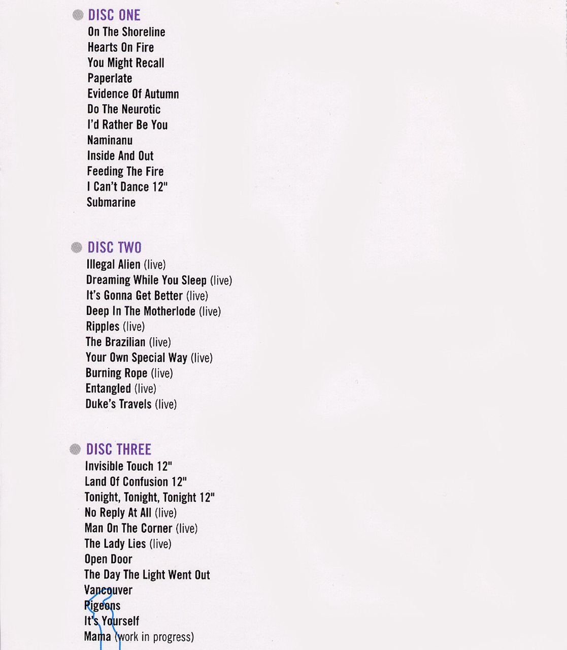 하지만 초 중반기 제네시스에 열광했던 분들께는 아마 세 번째 CD가 하이라이트이지 않을까 싶다. 앞 부분은 1973년 10월 20일 영국 런던의 레인보우 씨어터에서의 라이브로 [Selling England By The Pound]에서의 네곡과 [Foxtrot]의 명곡 ‘Suppers Ready'를 담고 있다. 이 음원은 이미 제네시스 매니어들 사이에서 명연으로 익히 알려진 것으로 역시 부틀렉 LP인 [Live 82], [In Concert 73]등에 수록되기도 했다. 물론 음질은 본 CD가 월등히 뛰어나다 이어 데뷔 당시 BBC ’John Peel Session'에서 연주한 ‘Stargnation'이 수록되어 잇으며 나머지 세 곡은 [Nursery Cryme]에서 [Selling England By The Pound]사이에 싱글로 발표된 곡들이다. 우선 ’Twilight Alehouse'는 싱글 ‘I Know What I Like'의 뒷면에 담긴 곡이며, 필자를 그토록 애타게 만들었던 ’Happy The Man'도 당시 버전 그대로 수록되어 있다. 이 두 곡은 연극적이고 장중했던 당시 제네시스 곡들에 비해 차분하고 파퓰러한 연주를 들려주고 있으나 나름대로의 독특한 매력을 듬뿍 담고 있다. 그리고 ‘Wather Of The Skies'는 ’Foxtrot'앨범 수록 원곡을 리믹스한 것으로 원곡의 도입부에 담긴 장엄한 멜로트론 연주가 생략되어 있다.