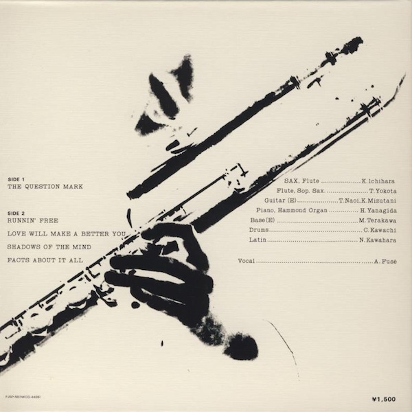 MUSICIANS: | - Kosuke Ichihara/ sax, flute - Toshiaki Yokota / flute, sax - Kimio Mizutani / guitar - Takao Fujii / guitar - Hiro Yanagida / piano, Hammond organ - Chito Kawachi / drums - Naomi Kawahara / percussion - Masaoki Terakawa / bass - Akira Fuse / voices |